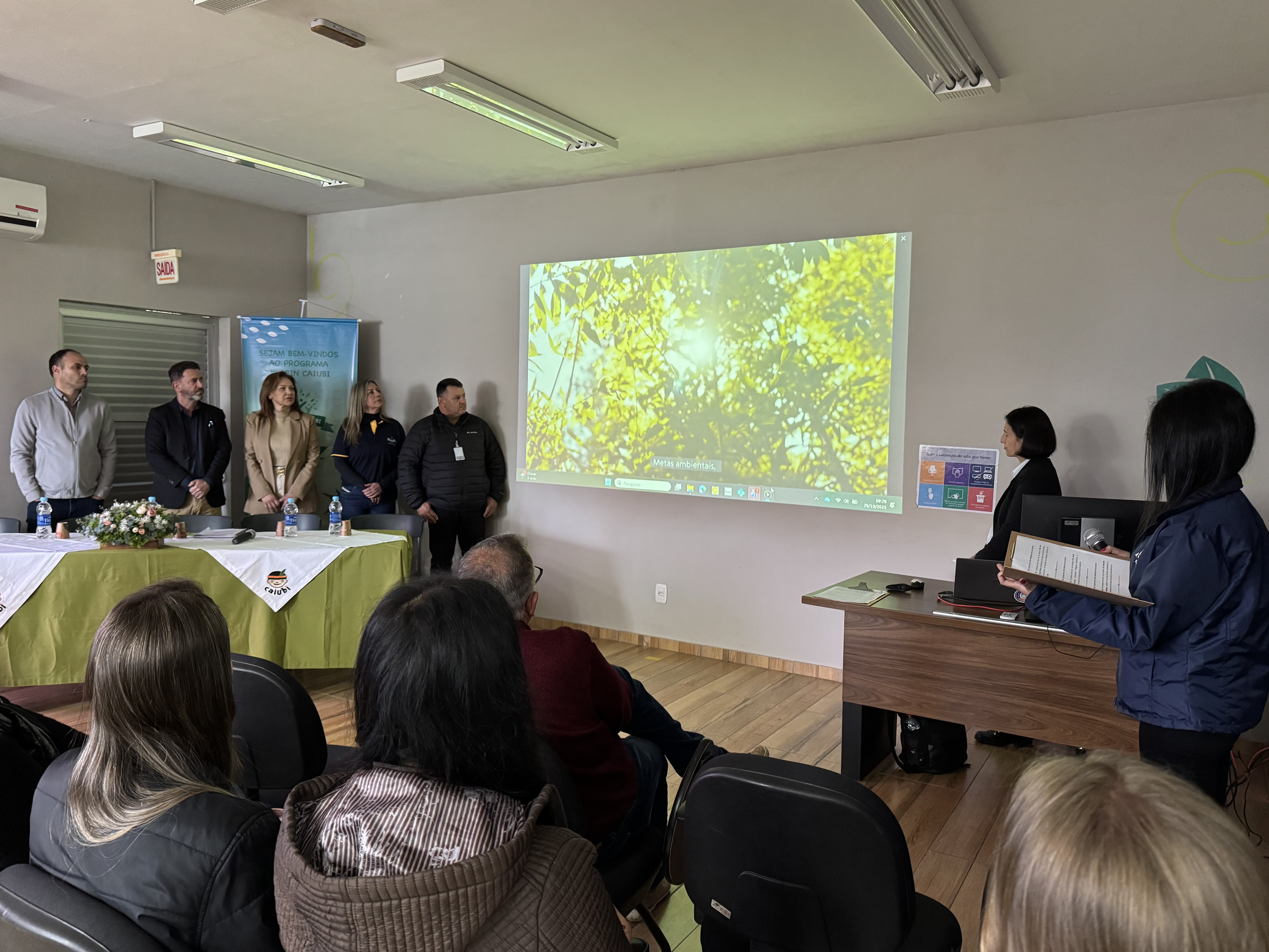 Palestra "Sistema de Gestão Ambiental Klabin" realizada pelo Coordenador de Responsabilidade Ambiental Industrial da Klabin, Sra. Felipe Broilo