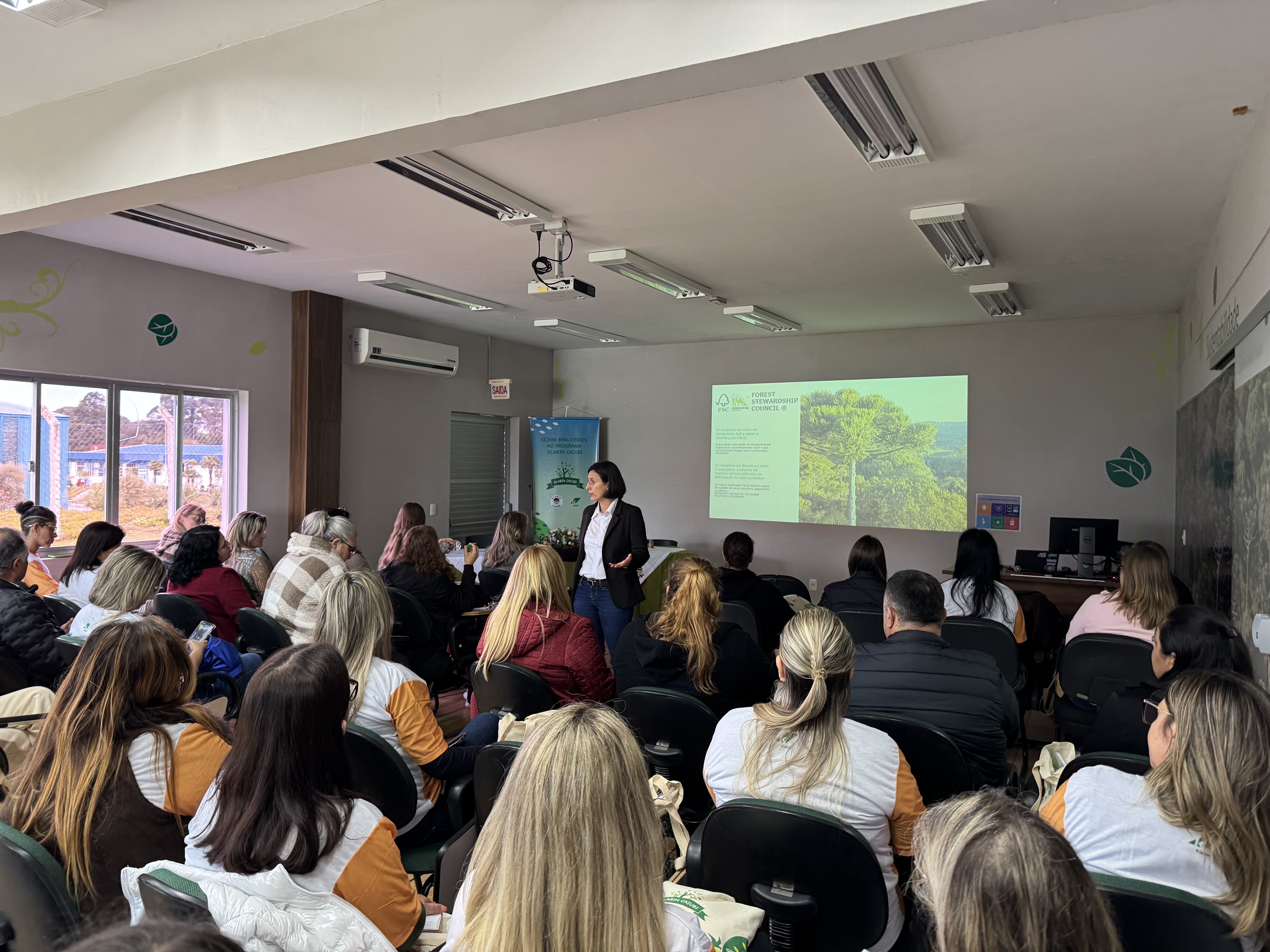 A primeira palestra "Plantações Florestais Sustentáveis" conduzida pela Coordenadora de Responsabilidade Socioambiental Mireli Moura Pitz Floriani, e abordou temas como o manejo em forma de mosaico realizado pela Klabin, os cuidados ambientais nas operações da empresa, as certificações florestais e de serviços ecossistêmicos da Klabin, conservação de solo, água e biodiversidade, entre outros.