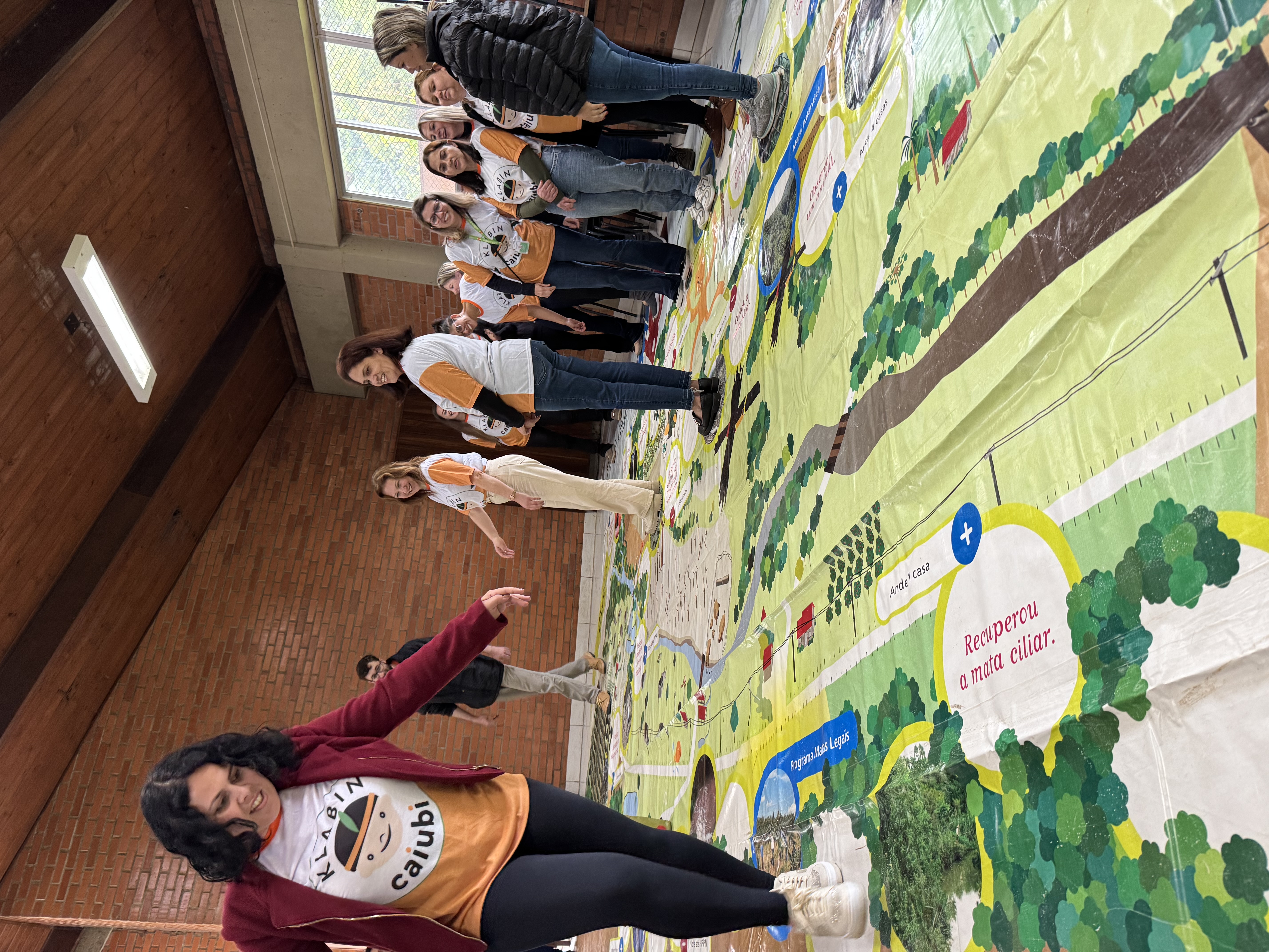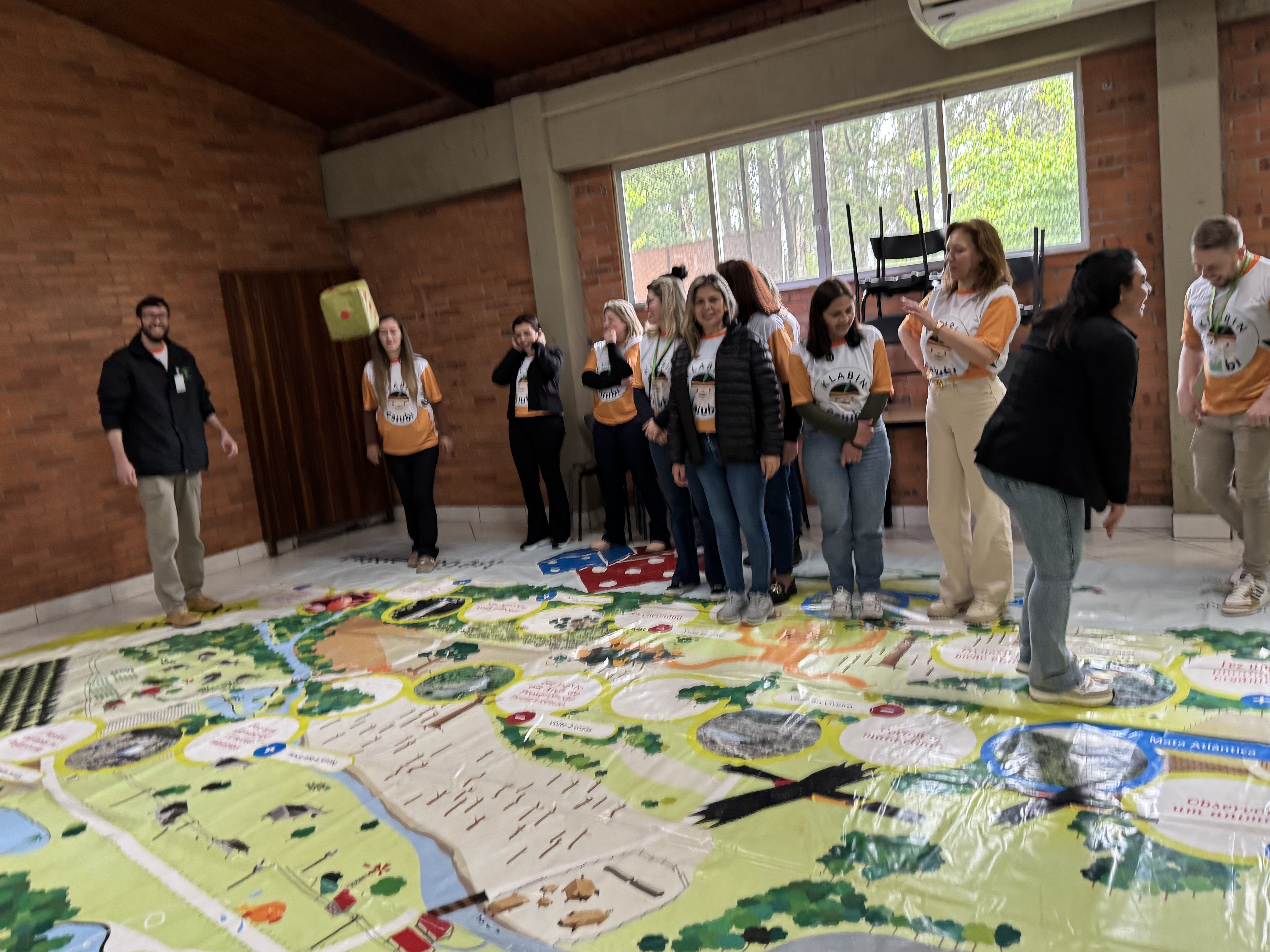 A terceira palestra foi conduzida pelo Eng. Florestal Leandro Casanova, da Associação de Preservação do Meio Ambiente e da Vida – APREMAVI, onde apresentou aos participantes os Programas Matas Legais e Sociais que dá apoio ao planejamento e adequação ambiental, legal e paisagística das propriedades, e realiza trabalhos de recuperação de áreas degradadas e conservação de remanescentes florestais, assim como, atuam com atividades de educação ambiental no estado. Com o encerramento da palestra, foi executada uma dinâmica em grupo “Jogão Fique Legal”, um tabuleiro de chão onde os participantes tentavam a sorte em um dado e andavam nas casas, o percurso contava com práticas florestais adequadas e inadequadas, fixando os aprendizados. Ao final das atividades os participantes foram contemplados com materiais didáticos importantes sobre preservação ambiental e entrega de mudas nativas.